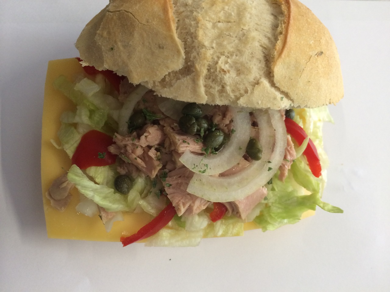 Grote bol tonijn met kaas, sla, uien, paprika en kappertjes.