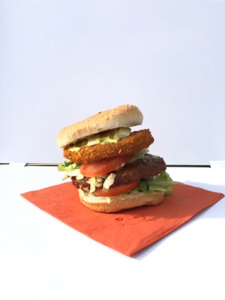 Bestaande uit een kip en een rund burger, als een ‘Dubbel Dekker’